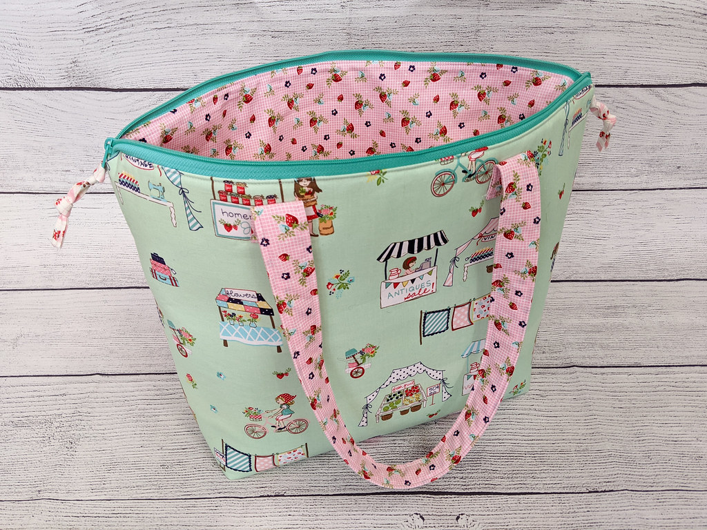 I finished this large, roomy tote a couple days ago and have already put it to use! It’s the perfect size to hold my 11″ x 11″ cross-stitch frame that was too tall for my previous cross-stitch bag (my ByAnnie’s Open Wide) and there’s extra room for my other stitching supplies. The construction was different than other bags I have made and I learned some new techniques!