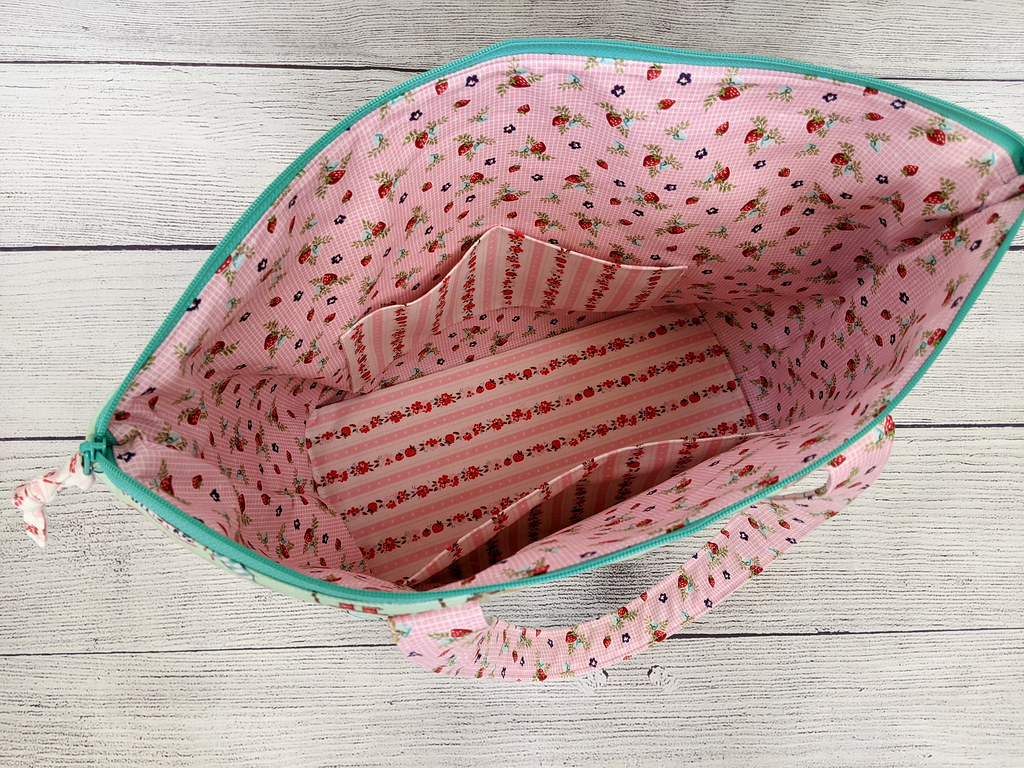 Even though we got behind during the class, my daughter did an awesome job of sewing this whole bag herself! Gone are the days where I have to help guide the fabric to keep it straight — she is definitely becoming more accurate and I can simply tell her to make a 1/4 inch seam or 1/8″ top-stitching and she can do it on her own! She plans to use her bag for her cross-stitch supplies as well!