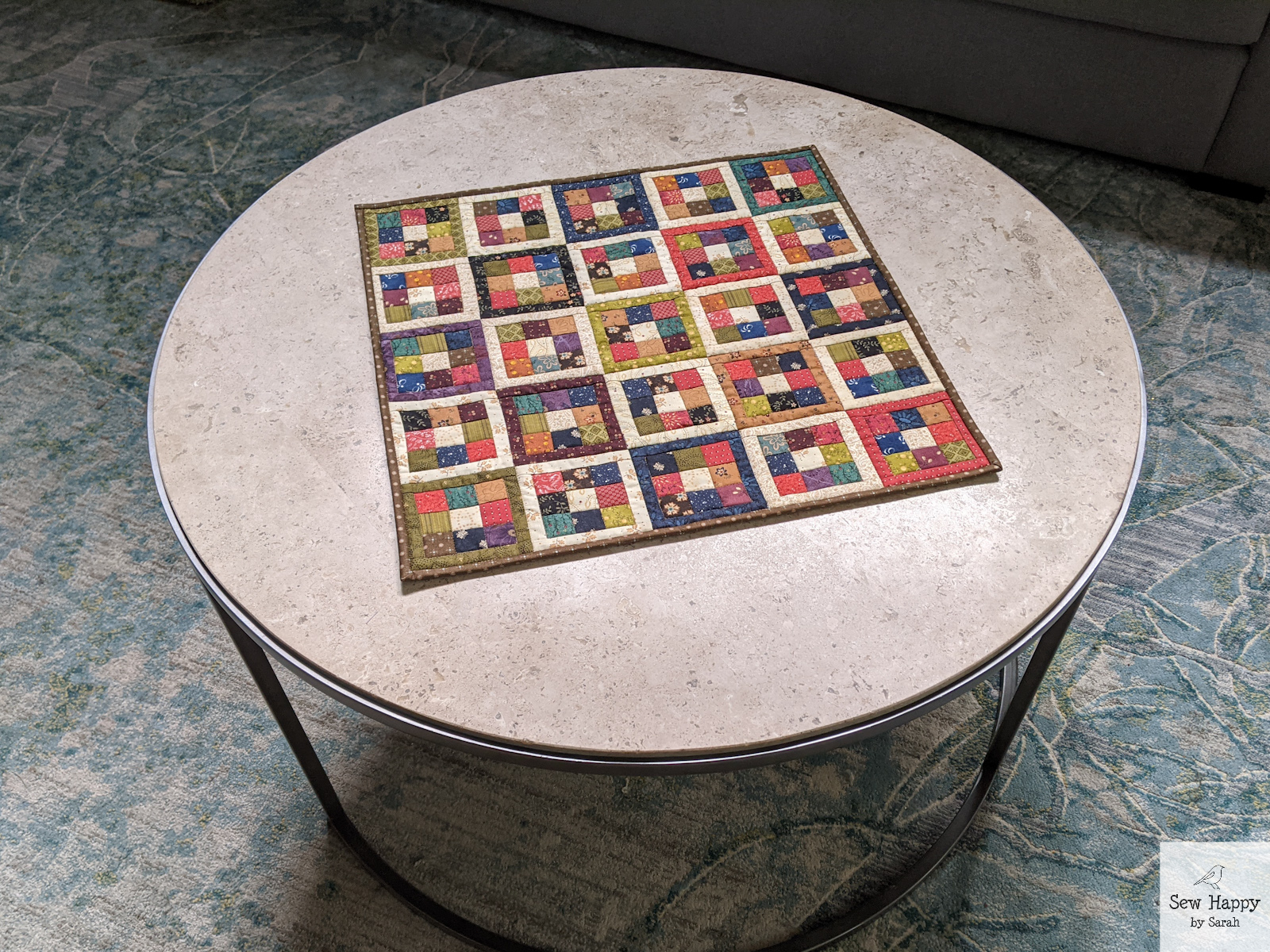 Another new year, another new Simple Whatnots Club! The first project from Simple Whatnots Club 12 is a true mini! I really like this size because smaller means a quicker finish. What cute diamond shapes in the center and colorful border. I’ve been working on my precision in seam construction (a 1/4″ seam is really important) and was pleasantly surprised everything came out accurate!