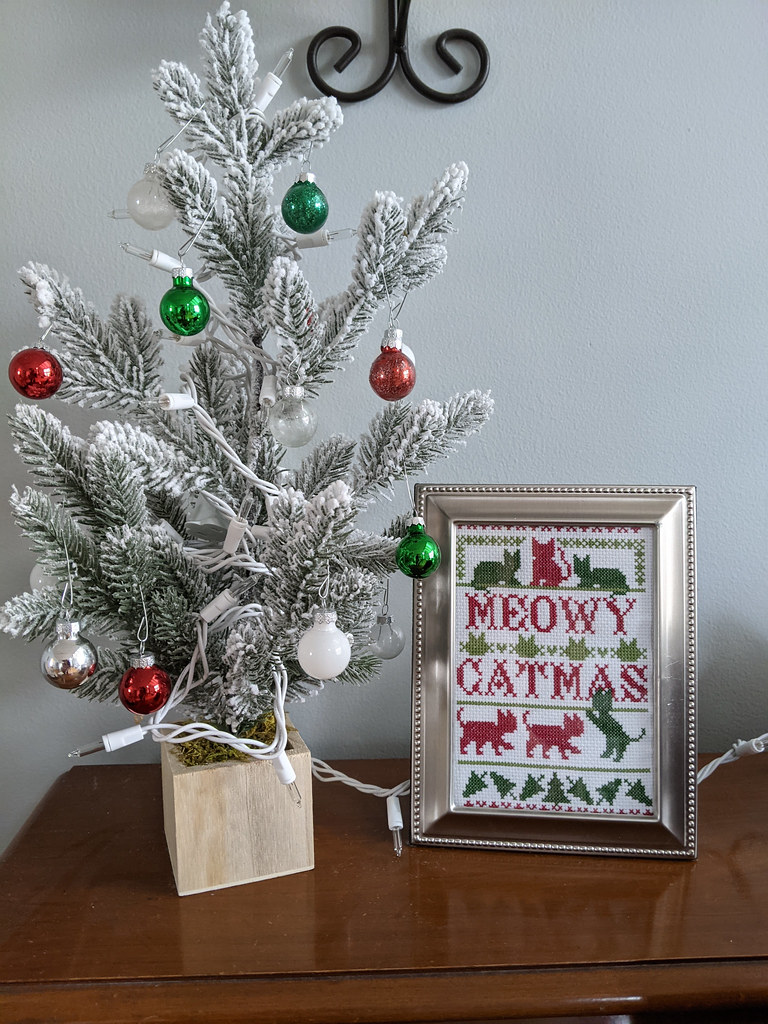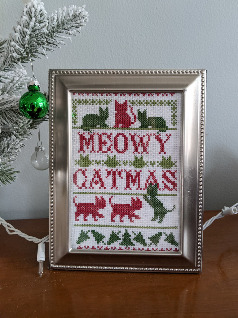 After my first successful cross stitch project (No Prob-Llama), I found another pattern by the same designer with another cute play on words: Meowy Catmas. Fitting, since we got two kittens this year!