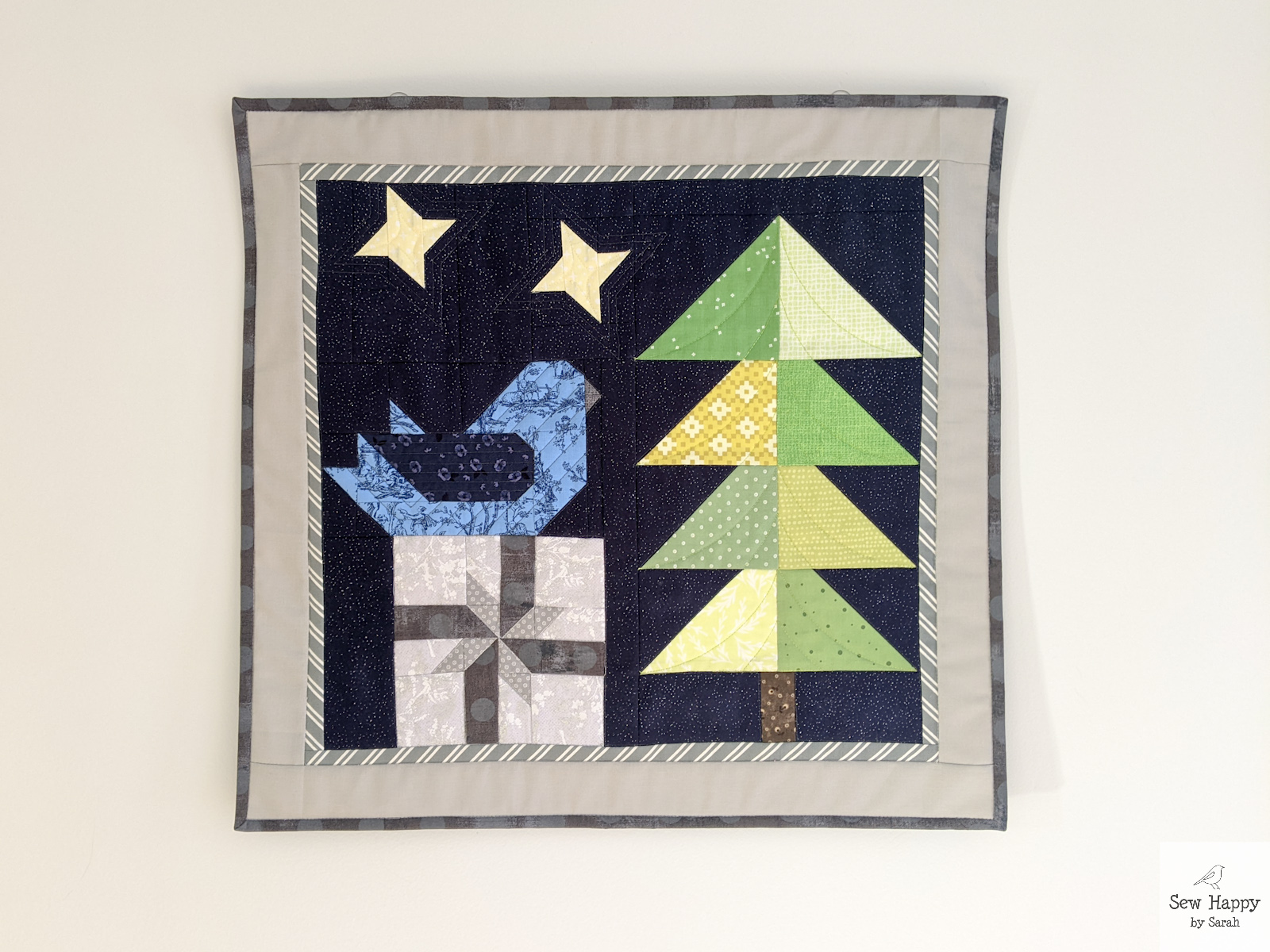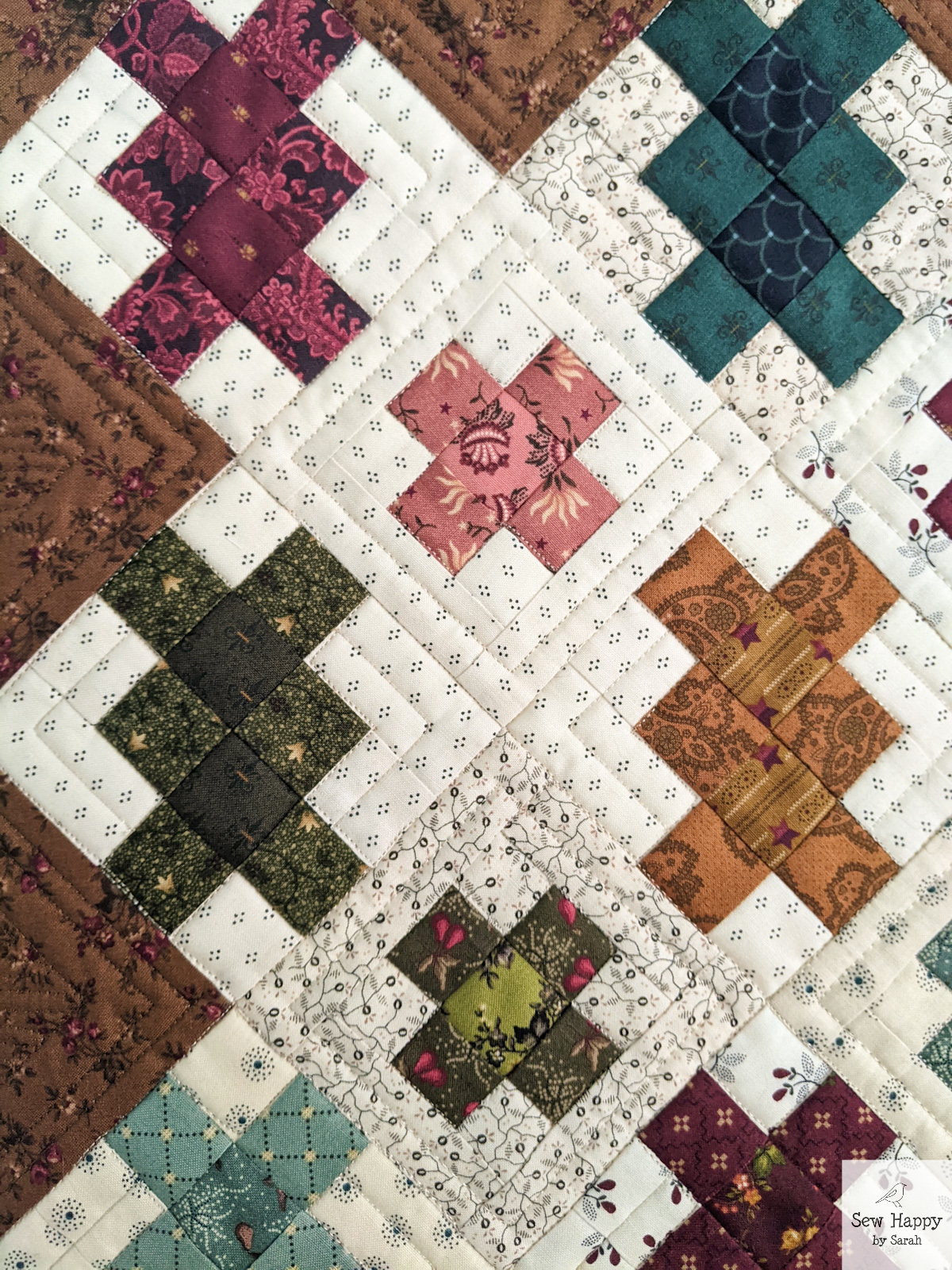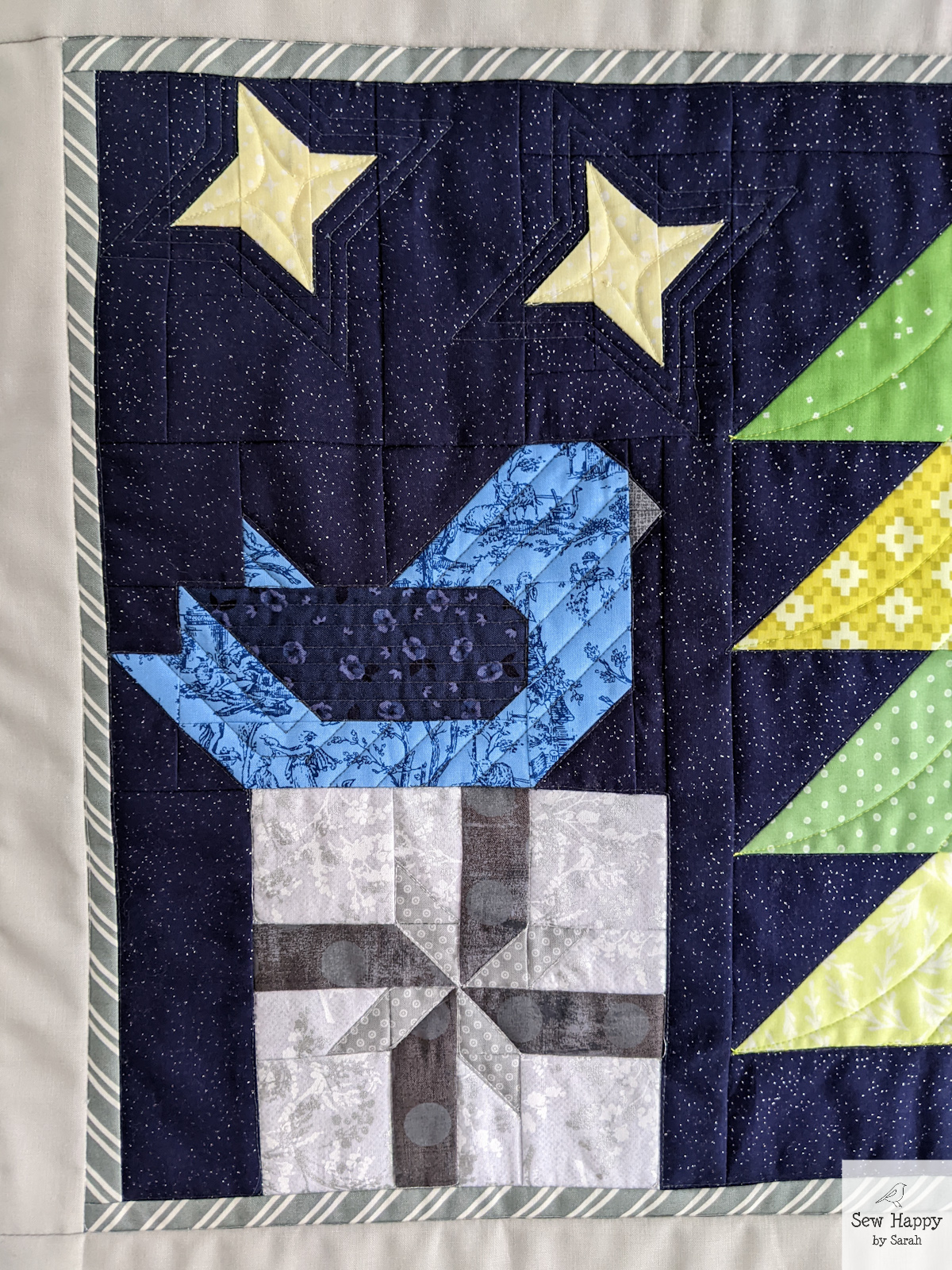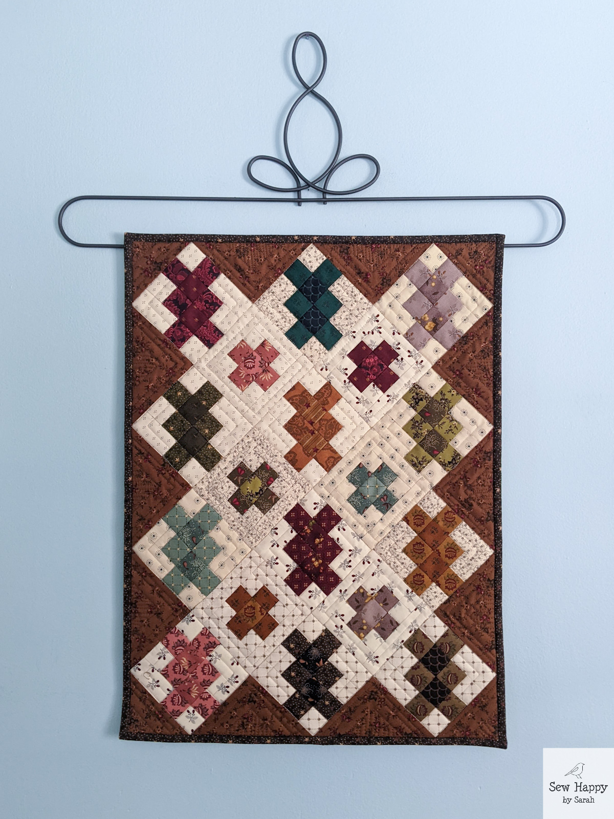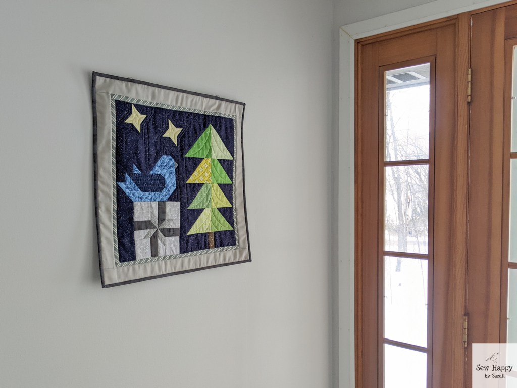 The cross-like shapes were fun to make. They were actually supposed to all be the same design, but I inadvertently changed the pattern of the light green/red blocks and didn’t see the difference until it was all assembled! Oh well — they remind me of ribbon wrapped around a gift!