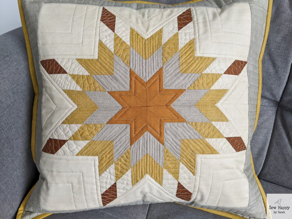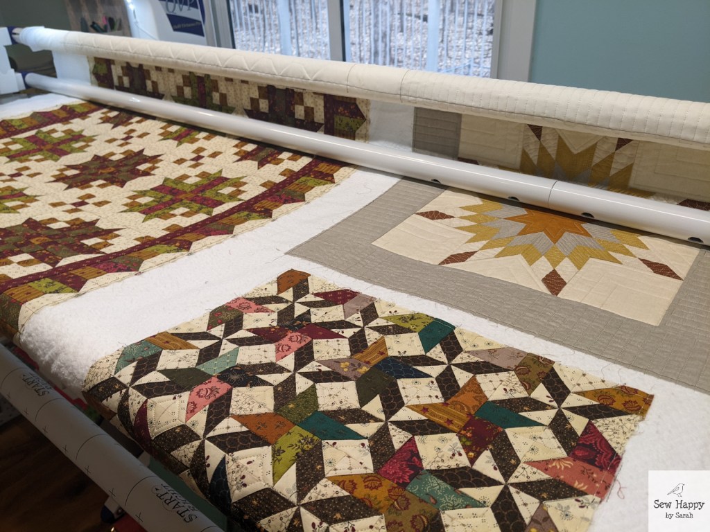 Surprisingly it magically matched up pretty good. I say “pretty good” because I did have to ease it in a little. And because of that easing, the center of the quilt ended up a bit “baggy”… I had spent so much time on it already that I didn’t want to take it apart and try to get it to fit better, so I thought, “I’ll just quilt it to death and maybe it won’t be noticable!” Hence, I progressively added elaborate arcs and dense fillers until it pounded down any loose fabric and made it look like an intentional medallion design. 🙂 (Shh! That’s my secret!) I’m actually very happy with it! The fact that it came out square and hangs on the wall straight (not wavy) gives me a bit of confidence about my long-arming skills!
