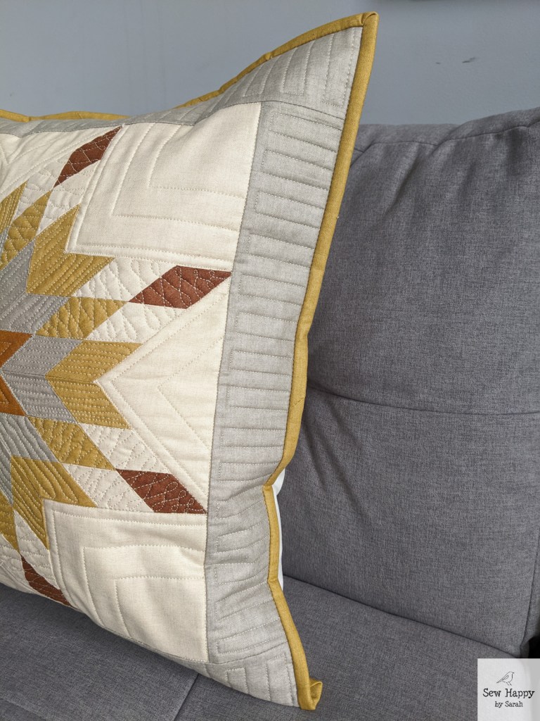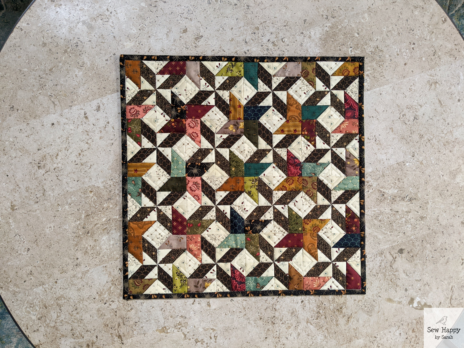 The border was very intriguing to me. It makes a nice frame around the piece and I love the alternating colors. In general, my block sizes are usually very close to the sizes given in the instructions, but I know they can be 1/4″ off. So, I was a bit wary about attaching the border and whether it was going to fit on perfectly. A solid strip of border is a bit easier to adjust the size if needed without being noticable!