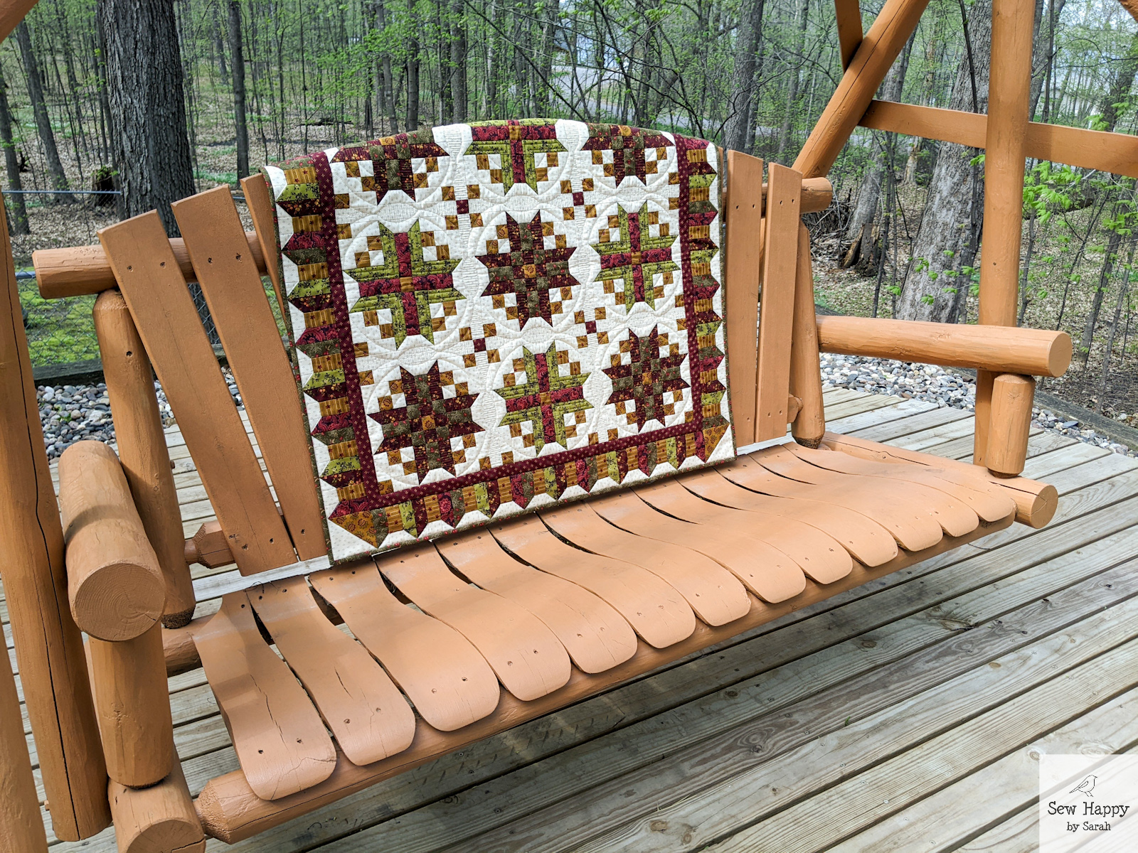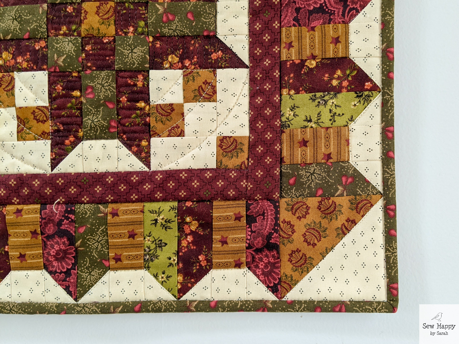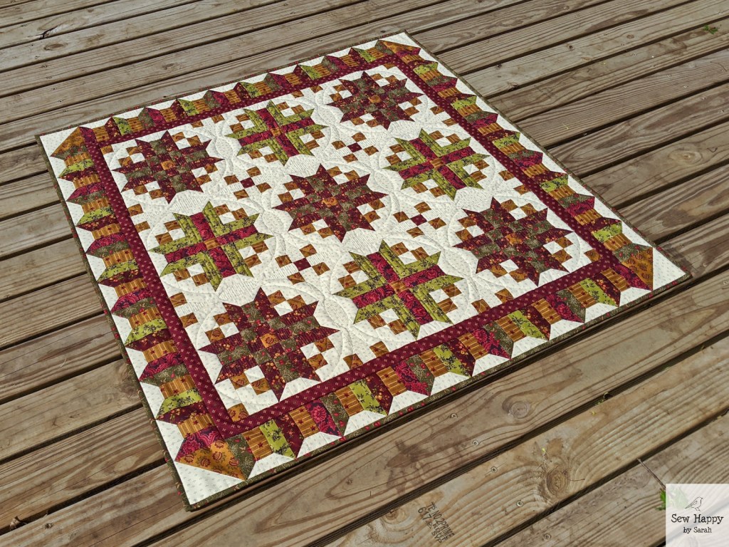 The third Simple Whatnots Club 11 project I completed is Keeping Room. Quite a bit larger at 35″ square, it definitely took longer to make. The pattern called for a more controlled color palette limited to the reds, greens, and golds in Kim Diehl’s Right As Rain fabric line. It was nice to try something different colorwise and with the unique blocks and border.