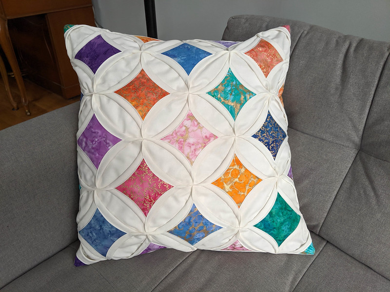I put this pillow cover on my longarm with a few other small projects I’ve been working on. I started by analyzing what part of the star I wanted to emphasize and did dense quilting in the rest to push it down. I played around with a couple different designs to add variety. For the border, I tried out to a rectangular pattern to keep it simple and clean, yet give it some texture. I really had fun with the quilting on this one!