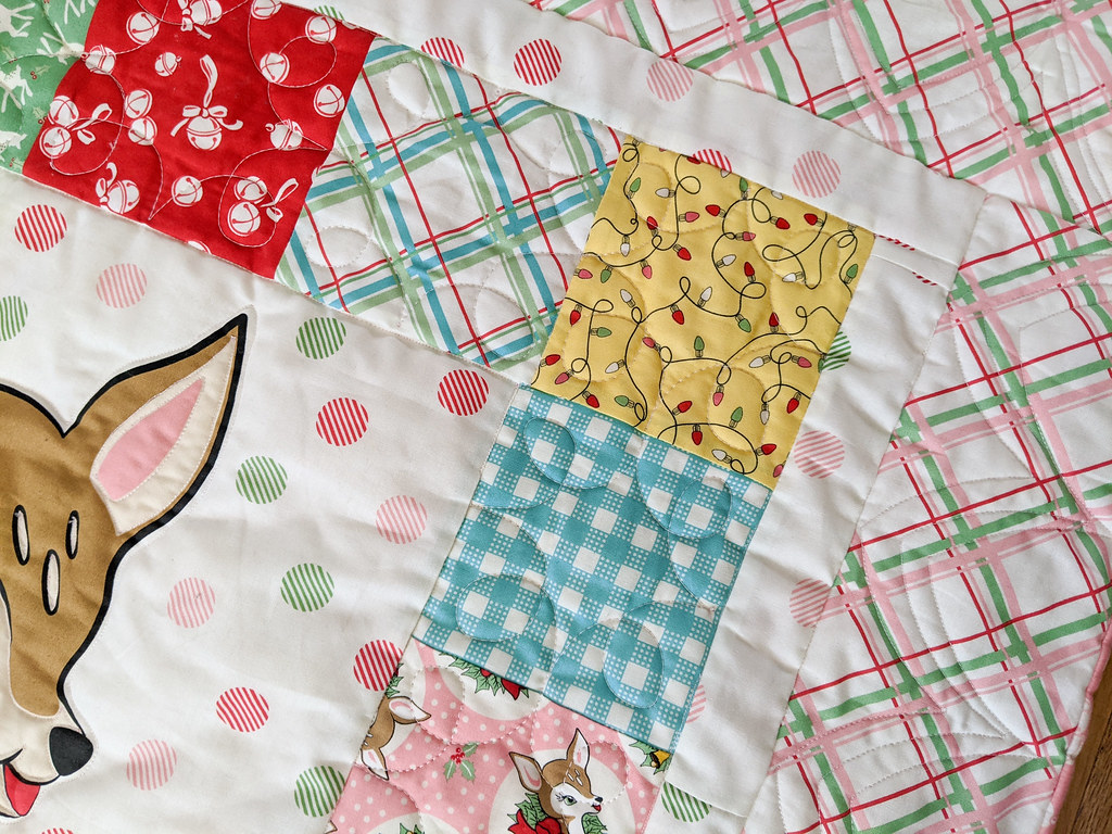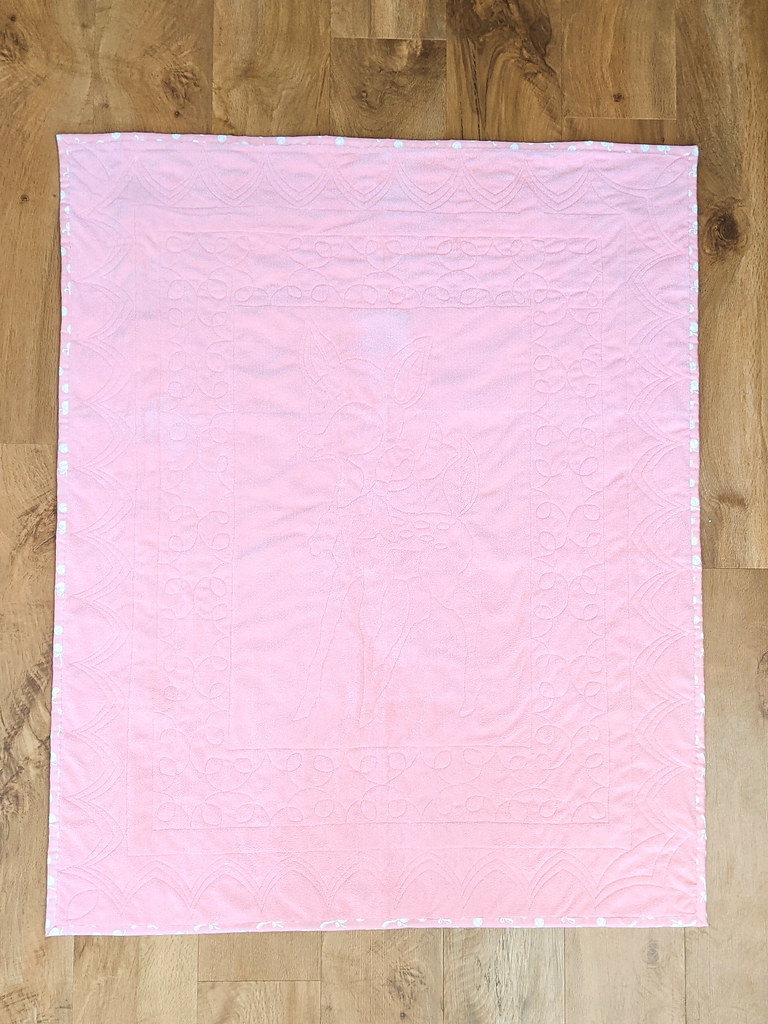 We added an extra outside border to make it a bit bigger (closer to a lap quilt size for her) and backed it with super soft Fireside by Moda to make it cuddly. It was my first time using Fireside and I love it! I had no problems quilting it with the longarm. I’ve got another piece of Fireside waiting for the back of my cat quilt when I make it.