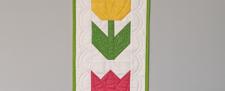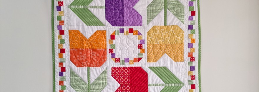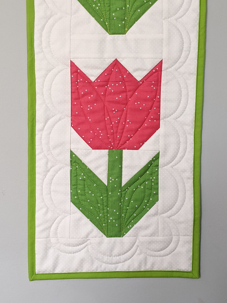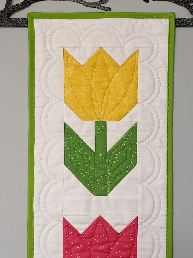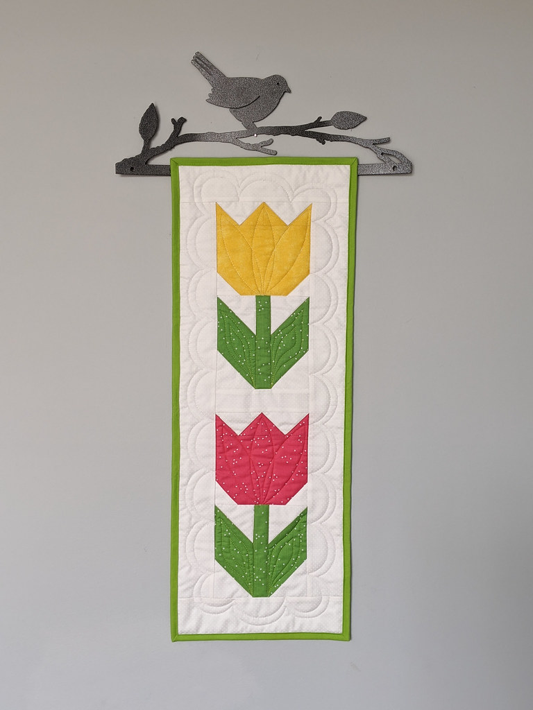 As I was gathering ideas for Spring decor projects, I remembered this Tulip Twist pattern and fabric kit I had purchased at Front Porch Quilt Shop two years ago. I pulled it out and made it along with my other recent tulip projects. I love the movement this piece creates! Both with the turning flowers and the dancing border.