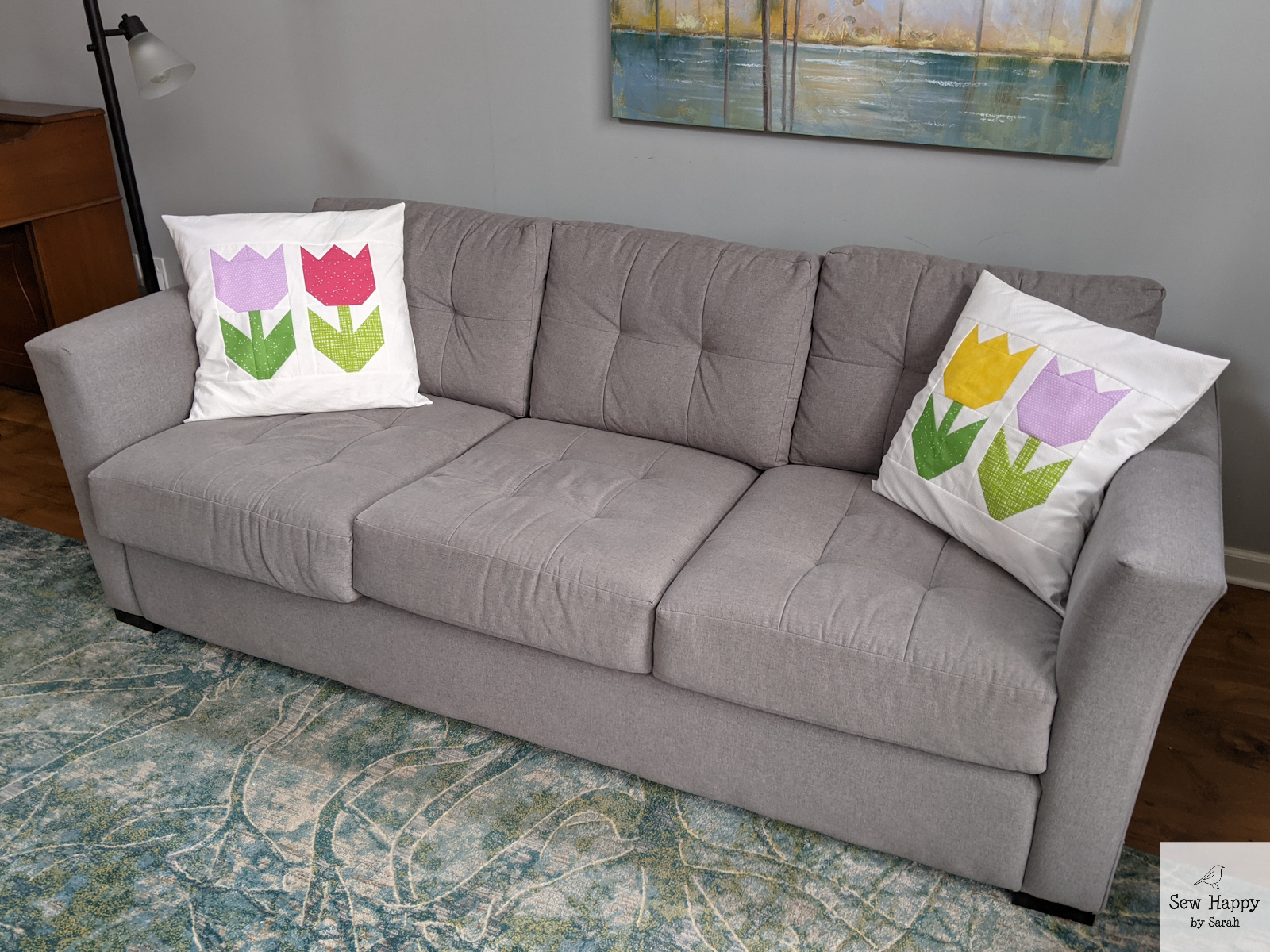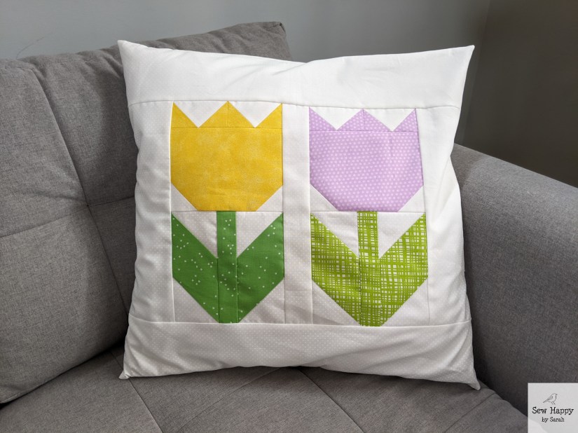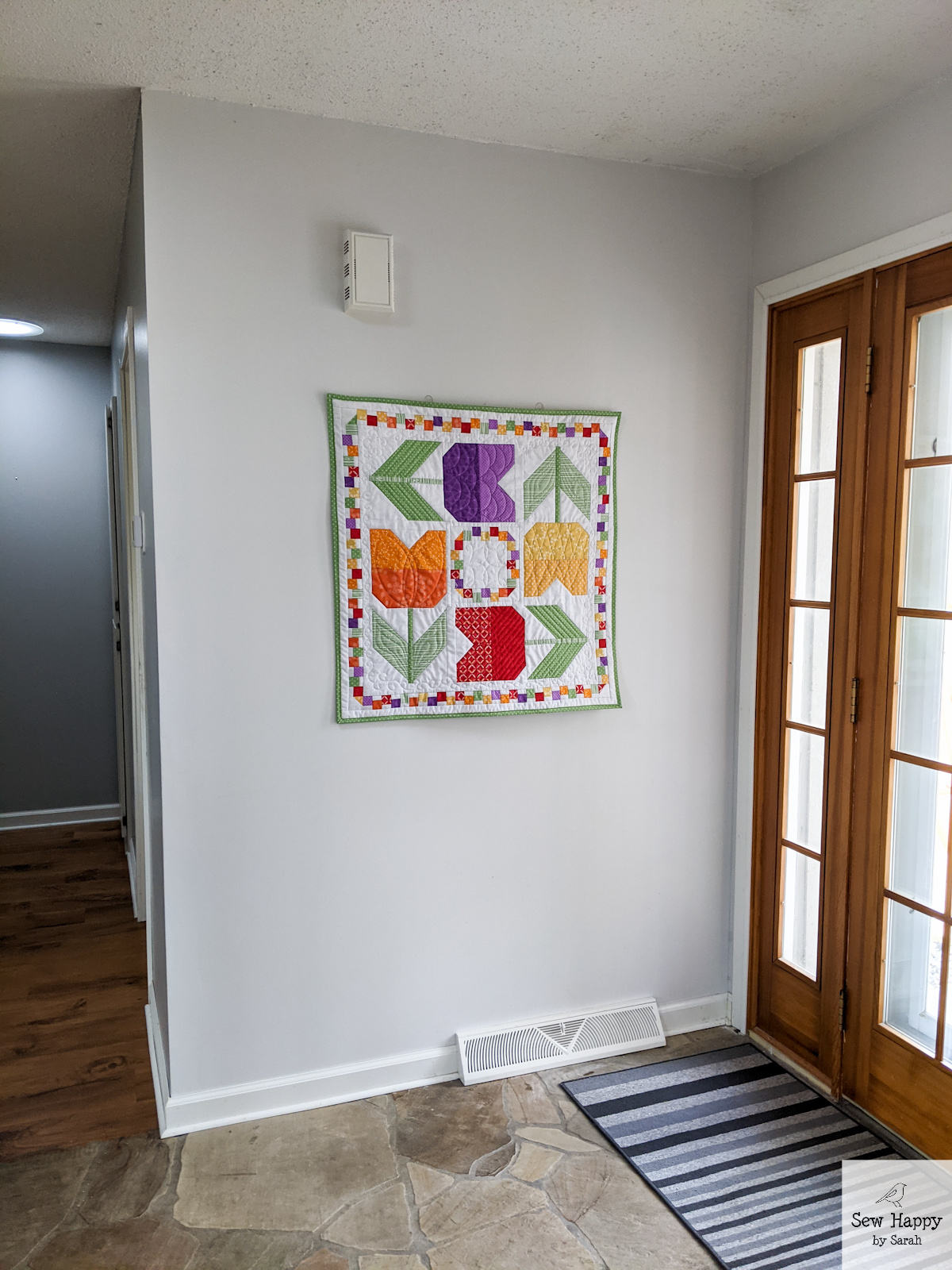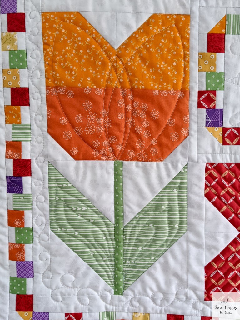 As I was gathering ideas for Spring decor projects, I remembered this Tulip Twist pattern and fabric kit I had purchased at Front Porch Quilt Shop two years ago. I pulled it out and made it along with my other recent tulip projects. I love the movement this piece creates! Both with the turning flowers and the dancing border.