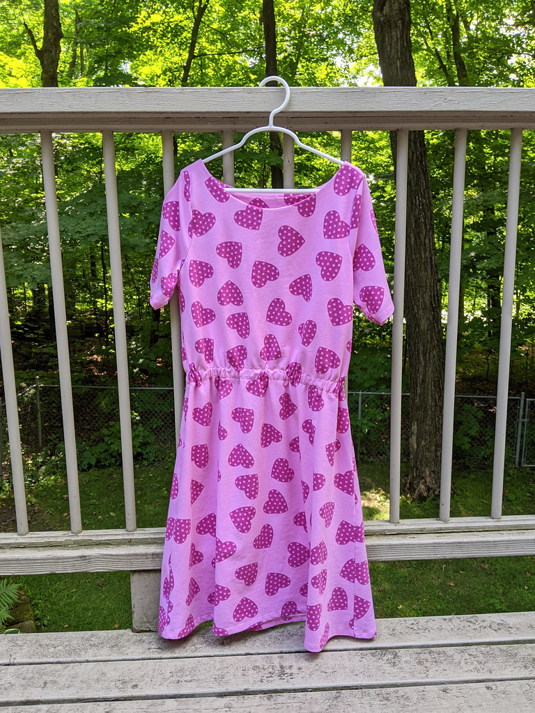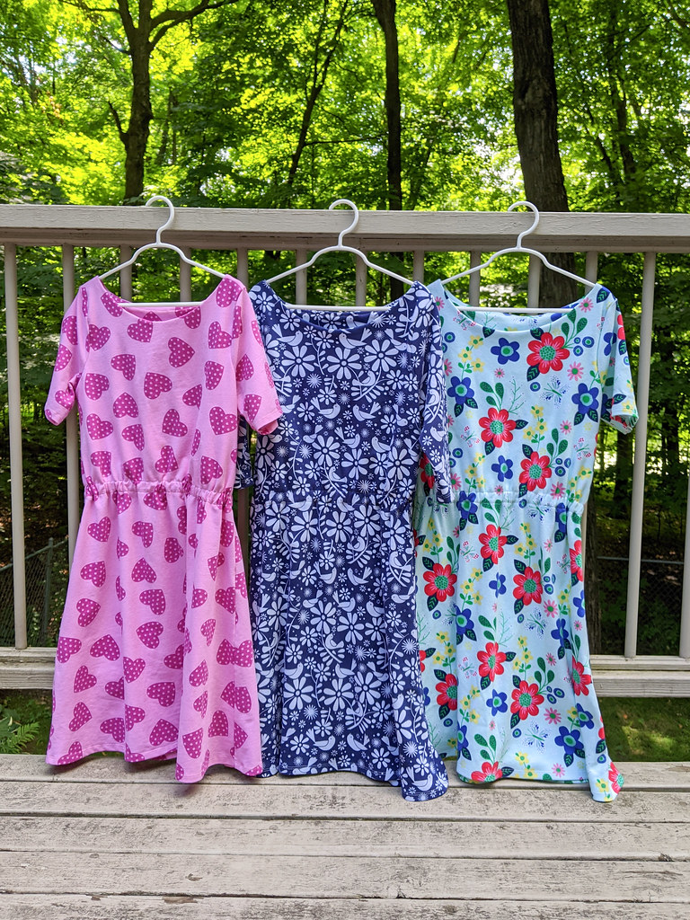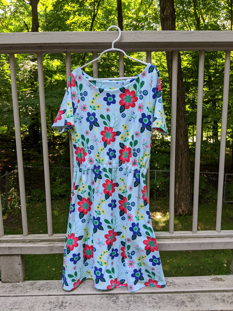 Size: 12 Style: Blue/White Floral - Elbow length, Pink and Light Blue Floral - Short sleeves Pattern: Saige's Boatneck Knit Dress by Simple Life Pattern Company