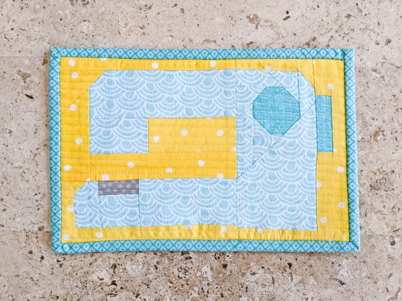 Next up was a table runner. I was determined to use up as many images from the panel as possible! I really liked the heart blocks that were included in the quilt pattern, so I made those as designed, but added white borders around them to make them the same size as the love letter and phone images from the panel. I thought surely this would help me put the pieces together easier! Unfortunately, I found that while those blocks lined up nicely with each other, they didn’t line up perfectly with the typewriter (which still wasn’t square!). After trying out a few layouts I decided to add a red border around some of the edges to make the two sides the same height as the typewriter. The design definitely changed from my original vision, but I’m happy with how it turned out.